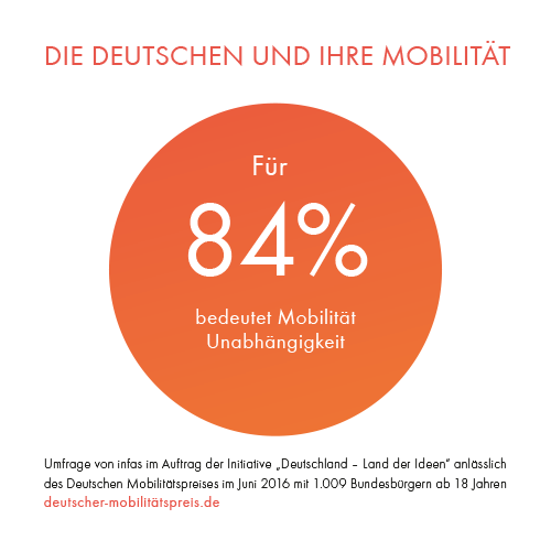 2. November 2016 – Mobilität ist Teil unserer persönlichen Freiheit und unserer Lebensqualität. Doch jeder Vierte in Deutschland findet Mobilität auch anstrengend. Das zeigt eine aktuelle Umfrage des Markt- und Sozialforschungsinsituts infas (1) anlässlich des Deutschen Mobilitätspreises.