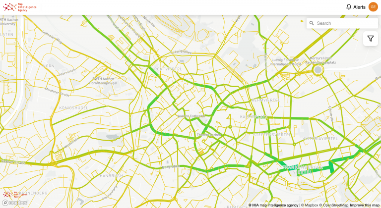 Based on real-time data provided by cities or companies, the MIA Mobility Engine offers analysis modules for dynamic data that provide insights into mobility. From this are derived targeted measures for the development of sustainable mobility. The MIA Mobility Engine offers various analysis modules. For example, with the route-analysis module, municipalities have the opportunity to gain insights into the travel behaviour of citizens and to verify the effects of traffic measures, such as pop-up bicycle paths.