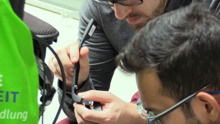 Hier knüpft munevo an: Bei munevo DRIVE handelt es sich um eine Smart-Glass-Applikation, die dem Nutzer die Steuerung des Rollstuhls durch Bewegungen des Kopfes erlaubt. Die Applikation nutzt dafür die in Smart Glasses verbaute Sensorik, um Kopfbewegungen in Steuersignale zu übersetzen. Diese Signale werden mittels eines Adapters an die Kontrolleinheit des Rollstuhls weitergeleitet, wodurch dieser sich in die gewünschte Richtung bewegt. Darüber hinaus kann mithilfe der smarten Brille ein Notrufsignal abgesetzt oder ein Foto geschossen und versendet werden. Die Nutzung einer Bluetooth-Schnittstelle ermöglicht zusätzlich die Kommunikation und Interaktion mit anderen Geräten, wie zum Beispiel Smart Phones oder Roboterarmen. Eine implementierte Software sorgt hierbei für Datensicherheit und schützt gegen externe Manipulation.