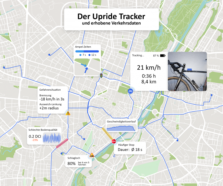Für die effiziente Planung und Instandhaltung von städtischen Fahrradwegen ist eine solide und verlässliche Datengrundlage unverzichtbar. Um die bestehenden Lücken dieser Datengrundlage zu schließen, haben sich die Initiatoren von Upride zum Ziel gesetzt: Mit einem speziell entwickelten Fahrrad-Tracker werden verschiedene Daten über den Verkehrsfluss und identifizierte Gefahrenstellen, wie Schlaglöcher oder Ausweichmanöver, erhoben.
